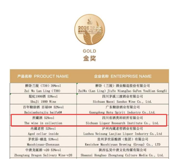 近日,由中国副食品流通协会主办的2025ISGC国际烈酒(中国)大奖赛获奖榜单盛大揭晓,酒科所全面自主研发、推动生产的自有品牌“所藏”酒,凭借卓越品质与独特风味,从国内外三百余家企业、共计616款参赛产品中脱颖而出,成功斩获大赛“金奖”。
